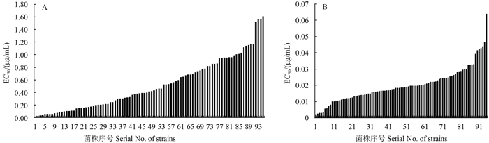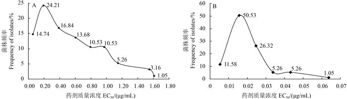 图 2 小麦纹枯病菌对苯醚甲环唑(A)和戊唑醇(B)的敏感性频率分布 Fig. 2 Frequency distribution of EC50 values of R. cerealis populations to difenoconazole (A) and tebuconazole (B) |