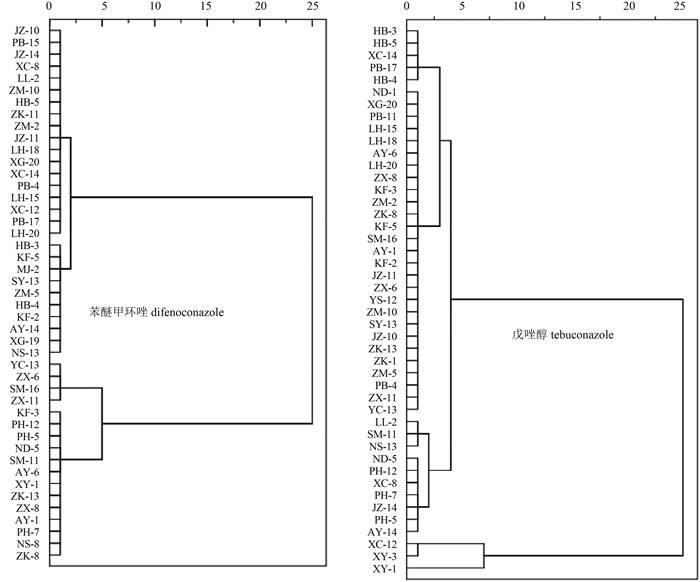 图 3 苯醚甲环唑和戊唑醇对小麦纹枯病菌EC50值的系统聚类分析 Fig. 3 Hierarchical cluster analysis on EC50 values of difenoconazole and tebuconazole to R. cerealis |