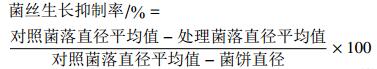 1.3 病原菌对2种杀菌剂的敏感性测定采用菌丝生长速率法[8]。将供试菌株在PSA平板上25 ℃培养3 d后,在菌落边缘打取直径5 mm的菌饼,菌丝面朝下分别接入含苯醚甲环唑0.025、0.05、0.1、0.5、2.5及5 μg/mL,或戊唑醇0.003、0.005、0.01、0.03、0.05及0.1 μg/mL的PSA平板上。每皿接种1个菌饼,每处理重复3次,以不含药剂的PSA平板上接种的菌饼作对照。25 ℃下培养5 d后采用十字交叉法测量菌落直径(mm),按(1)式计算各浓度处理下药剂对菌丝生长的抑制率(%)。