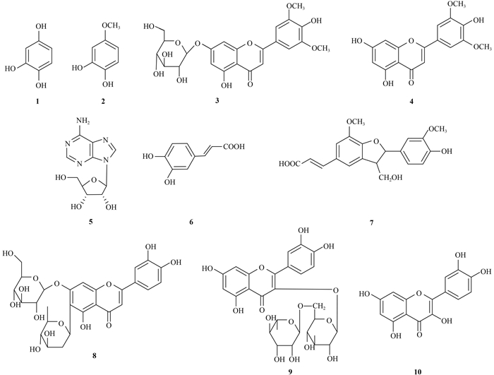 本研究从金丝草乙酸乙酯提取物中分离得到10个已知化合物,包括5个黄酮及其苷类,3个多酚类,1个生物碱类和1个木脂素类化合物,其中化合物2、3、5、7和10为首次从该植物中分离得到,且β-腺苷(5) 和留兰香木脂素B (7) 分别是首次从该植物属中分离得到的生物碱类化合物和木脂素类化合物。