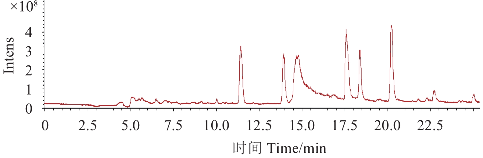 图 1 HPLC-MS检测烟嘧磺隆降解产物总粒子流图 Fig. 1 Total ion chromatography of degradation products of nicosulfuron detected by HPLC-MS |