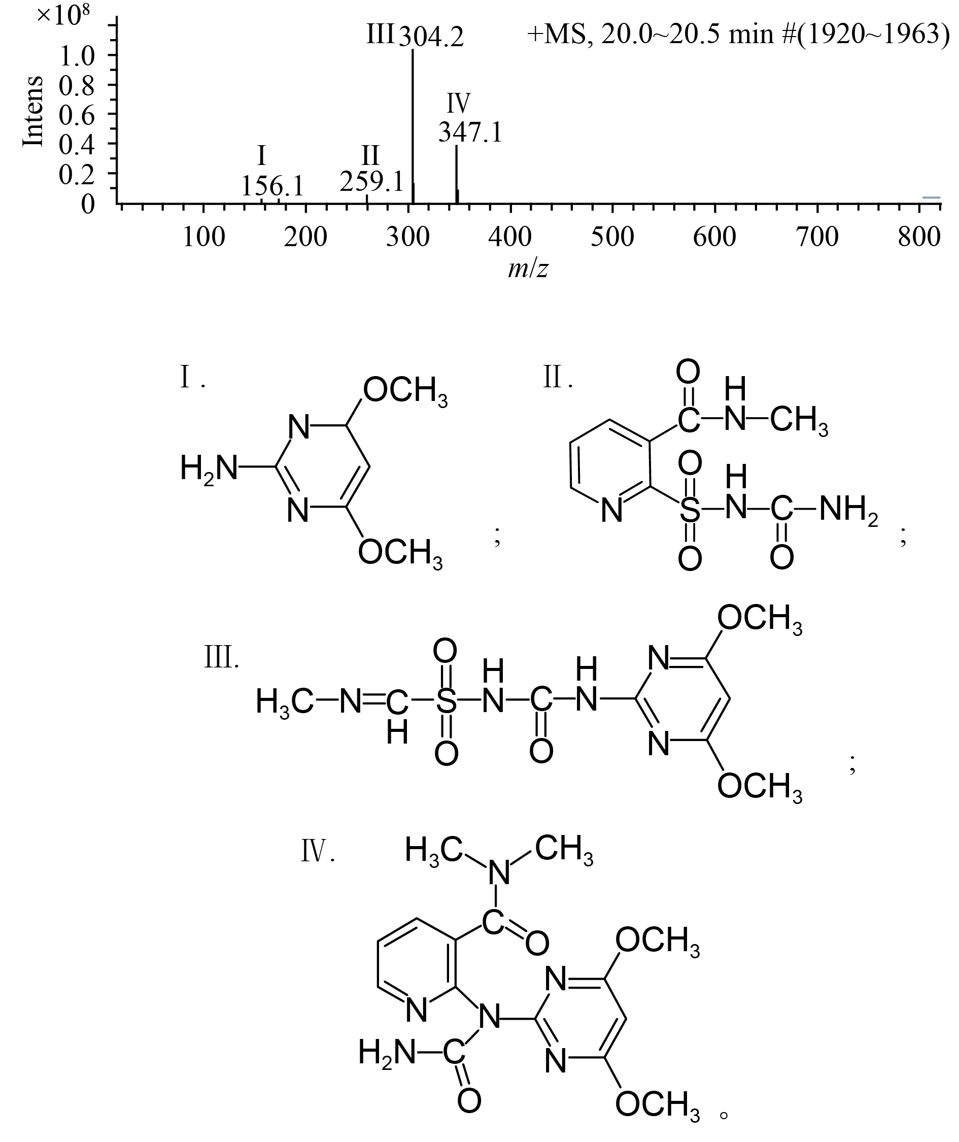 图 2 烟嘧磺隆降解产物质谱图 Fig. 2 Mass spectrum of degradation products of nicosulfuron |
