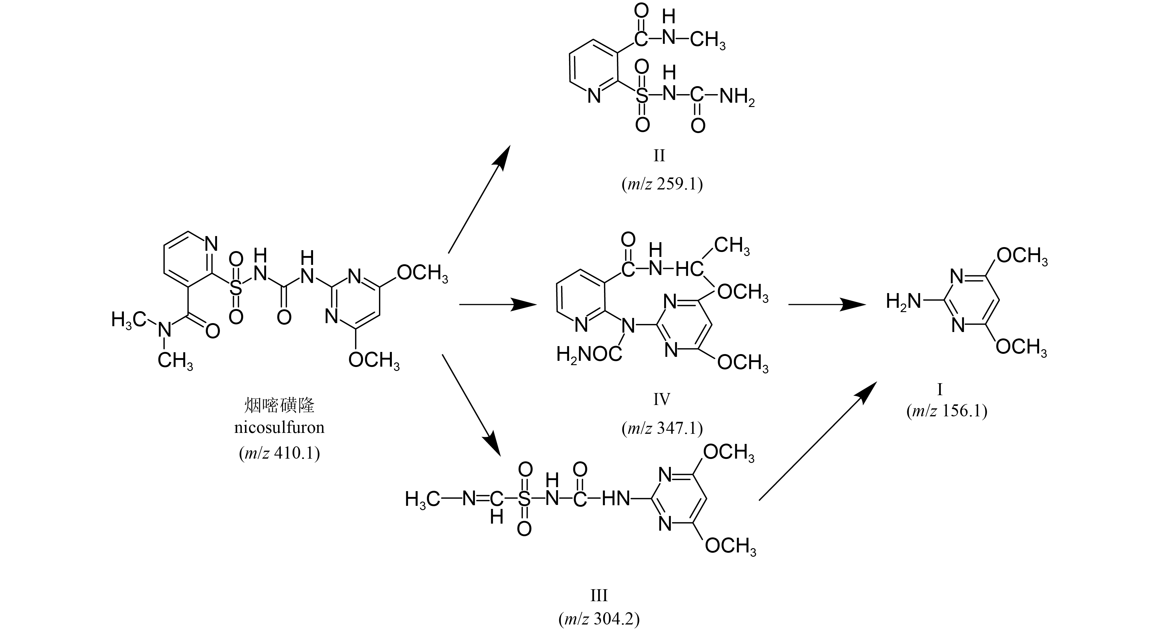 磺酰脲类除草剂烟嘧磺隆是一种在玉米田广泛使用的高效低毒除草剂[1],该类药剂水溶性极强,易进入土壤,造成水体污染,破坏生态环境,对土壤及地下水产生毒性,影响人类健康[2]。目前,烟嘧磺隆的微生物降解一直是研究人员关注的焦点[3]。齐萌等[4]从烟嘧磺隆生产厂污水处理池中分离到1株可高效降解烟嘧磺隆的枯草芽孢杆菌Bacillus subtilis,并检测到2种降解产物。Zhang等[5]分离得到1株可高效降解烟嘧磺隆的细菌粘质沙雷氏菌Serratia marcescens N80,并确定其对烟嘧磺隆的降解是通过破坏磺酰脲桥实现的。周珊等[6]研究发现,LAM-WHM-ZC (Oceanisphaera psychrotolerans) 菌株对烟嘧磺隆的降解效率最高,并检测到8种降解产物。赵卫松[7]检测到了粪产碱杆菌Alcaligenes faecalis ZWS11菌株对烟嘧磺隆的4个降解产物,其中产物4,6-二羟基嘧啶为首次报道。