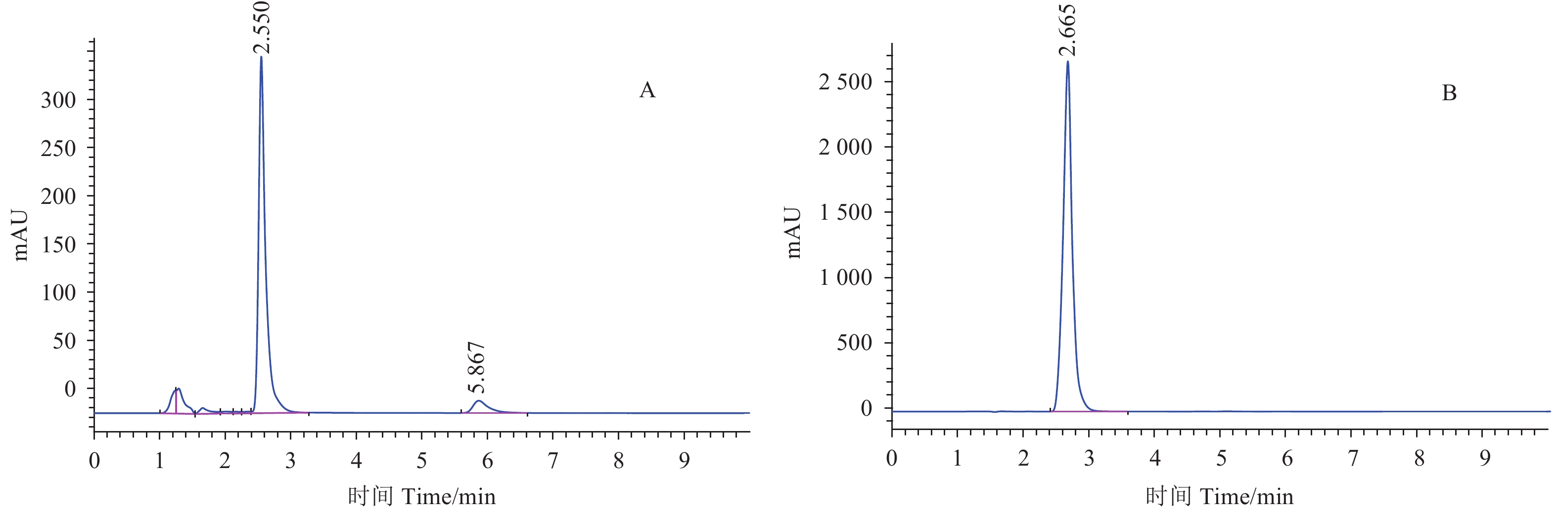 A:培养7 d的培养液;B:2-氨基-4,6-二甲氧基嘧啶标样。 A: culture medium after 7 d; B: the standard sample of 2-amino-4,6-dimethoxy pyrimidine. 图 4 蜡状芽孢杆菌降解烟嘧磺隆所得产物的高效液相色谱图 Fig. 4 High-performance liquid chromatogram of the degradation product of nicosulfuron by B. cereus |