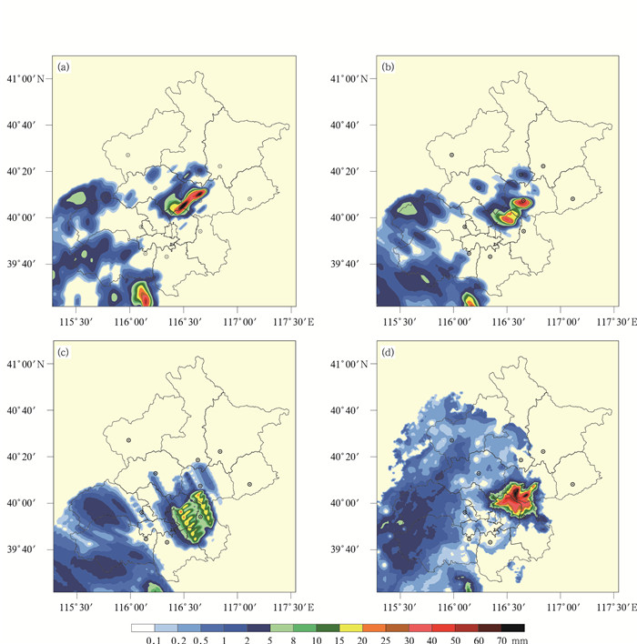 | 图 2 2017年7月13日14时30分起报的1 h定量降水外推预报的增长半径试验 (a.融合前降水预报场,b.10 km增长半径的降水预报场,c.200 km增长半径的降水预报场,d.降水分析场) Fig. 2 Precipitation nowcasts based on original TREC vectors (a), the blending vectors of 10 km growth-radius (b), and the blending vectors of 200 km growth-radius (c) started at 14:30 UTC 13 July 2017 with a lead time of 1 h, and precipitation analysis field at 15:30 UTC (d) |