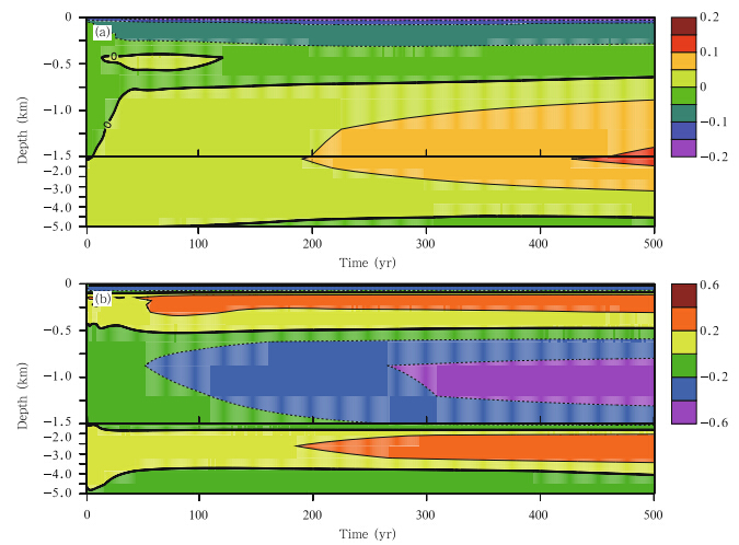 Figure 1 shows the anomalous annual mean temperature and salinity of LICOM2 as a function ofdepth and time against observations from WOA05.A detailed vertical structure and the evolution of themodel drift are revealed. It is seen that a rapid adjustmentoccurs in the first 50 years. After that time,thetemperature and salinity above 500 m reach a quasiequilibriumstate with cold and fresh water in the uppermixed layer and warm and fresh water in the tropicalthermocline. Below 500 m,the temperature and salinity drift gradually after the first 50-yr integration, and the salinity has a slight trend even in the last 50-yr integration. This suggests that longer integrationis needed to reach an equilibrium state in the deeperocean.