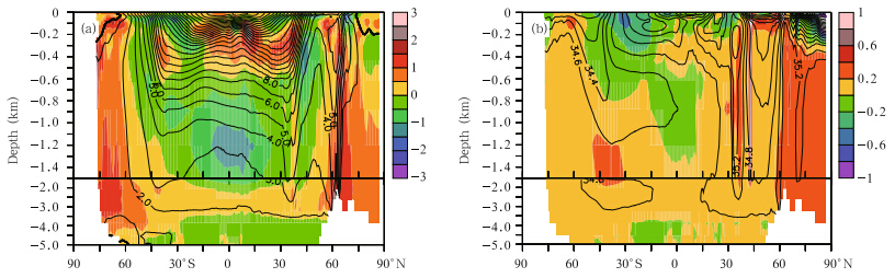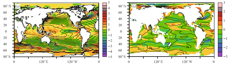 | Fig. 5.(a)Zonal averaged potential temperature(℃; contour) and the difference(℃; shaded)between LIOM2 and WOA05(Locarnini et al., 2006).(b)As in(a),but for sea surface salinity(psu). The observation is from Antonov et al.(2006). |
