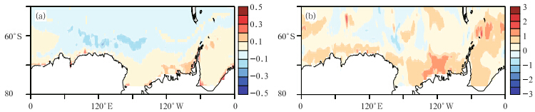 | Fig. 3. The differences of(a)sea ice concentration(%) and (b)SST(℃)for two sensitive experiments using prescribedsea ice data from the Hadley Centre of Met Office and NSIDC. |