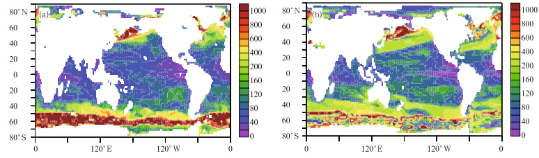 | Fig. 4. The maximum mixed layer depth for the climatology of(a)WOA05 observation(Locarnini et al., 2006) and (b)LICOM2 simulation. |