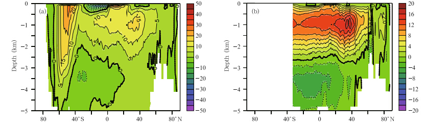 | Fig. 6.(a)Global and (b)Atlantic meridional overturning stream-function(Sv = 106 m3 s−1)for LICOM2. |