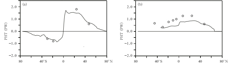 | Fig. 7.(a)Global and (b)Atlantic polarward heat transport(PHT; PW = 1015 W)for LICOM2(solid). The dots areestimations from Ganachaud and Wunsch(2003). |