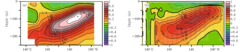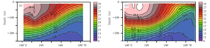 | Fig. 8. The potential temperature(℃)along the equatorial Pacific for(a)Johnson et al.(2002) and (b)LICOM2. |