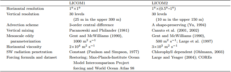 In the past several years,we aimed at reducingthe uncertainties of the upper layer temperature inLICOM1,because it is crucial not only for the surfaceheat fluxes determining the long-term behavior of thewhole climate model,but also for simulating air-seainteraction associated with climate variability on seasonalto interannual timescales. Various key physicalprocesses in LICOM1 have been improved,includingthe vertical turbulent mixing scheme,the solar radiationpenetration scheme(Lin et al., 2007),the advectionscheme(Xiao and Yu, 2006), and the upperlayer taping scheme in the mesoscale eddy parameterization.Besides,the meridional resolution between10°S and 10°N(Liu et al., 2004a) and the vertical resolutionin the upper 150 m(Wu et al., 2005)are alsoincreased to better resolve the equatorial wave-guide and the tropical thermocline,respectively. The detailof those improvements is shown in Appendix A.