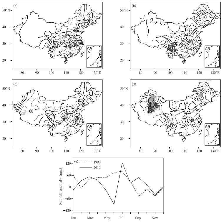 | Fig. 1. Summer(July-August)rainfall anomalies over China in(a)2010 and (b)1998.(c, d)as(a, b)but for therainfall anomaly percentage, and (e)seasonal evolution of rainfall anomalies in the middle and lower reaches of theYangtze River. Contour interv als are 30 mm mon-1in(a, b) and 30% in(c, d). Shading indicates the area with rainfallanomaly percentage greater than 100%. |