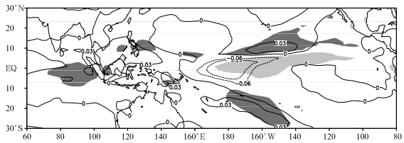 | Fig. 10. Simulated anomalous vertical pressure velocity at 500 hPa in December 2009(contour) and 1997(shaded).Anomalous vertical velocities greater than 0.03 Pa s-1 and less than -0.06 Pa s-1are light-shaded and dark-shaded, respectively . |