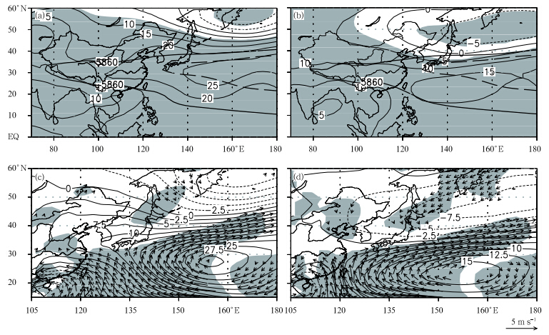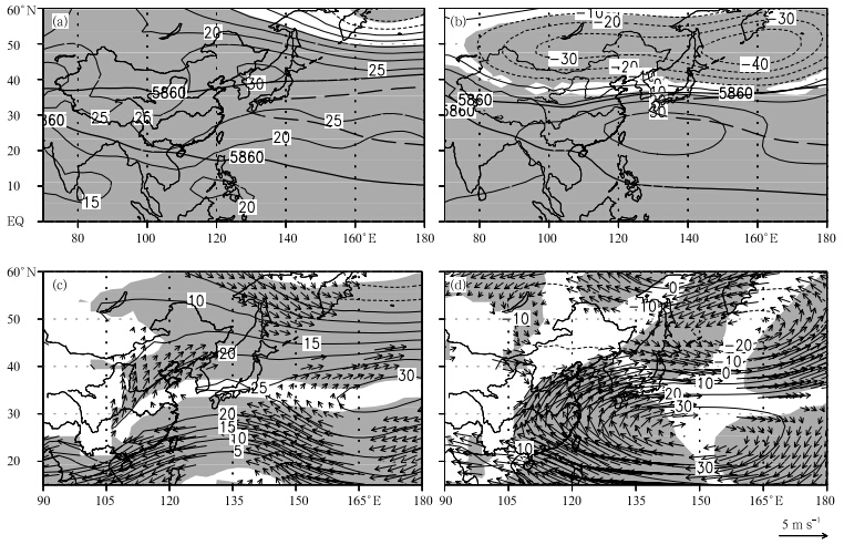 | Fig. 9. July-August mean of the simulated 500-hPa anomalous geopotential height for(a)2010 and (b)1998(contourinterv al is 10 gpm; thick line denotes climatological mean); and 850-hPa anomalous geopotential height(contour; gpm) and wind fields(vector; m s-1; areas with values at the 90% significance level are shaded)for(c)2010 and (d)1998. |
