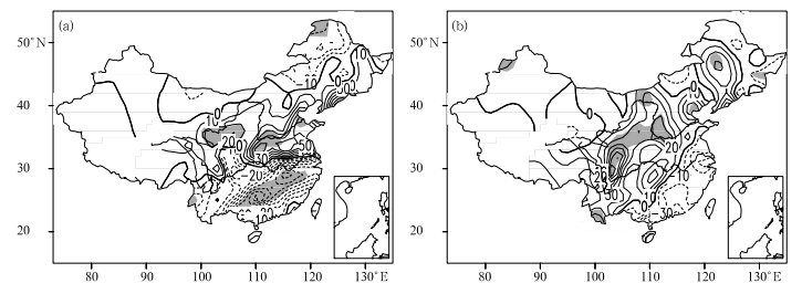 | Fig. 12. Summer(July-August)rainfall anomalies over China for(a)composite El Niño Modoki and (b)traditionalEl Niño decaying years. Contour interv al is 10 mm mon-1; areas with values at the 90% signi¯cance level are shaded. |