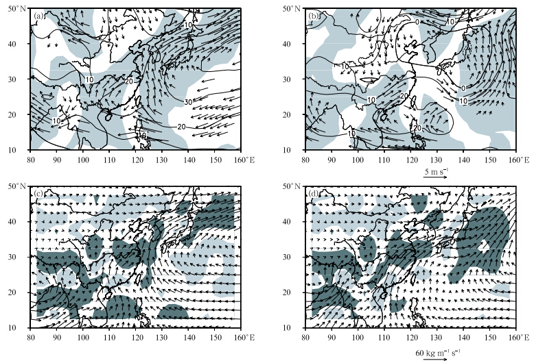| Fig. 2. July-August averaged 850-hPa anomalous wind(vector; m s-1) and geopotential height(contour; gpm)in(a)2010 and (b)1998; integrated water vapor flux from surface to 300 hPa(vector; 0.1 kg m-1s-1) and divergence(shaded; 10-4 kg m-2 s-1)in(c)2010 and (d)1998. Anomalous southerlies are shaded, vectors less than 0.6 m s-1are omitted, and divergences less than -5 and more than 0 are shaded. |