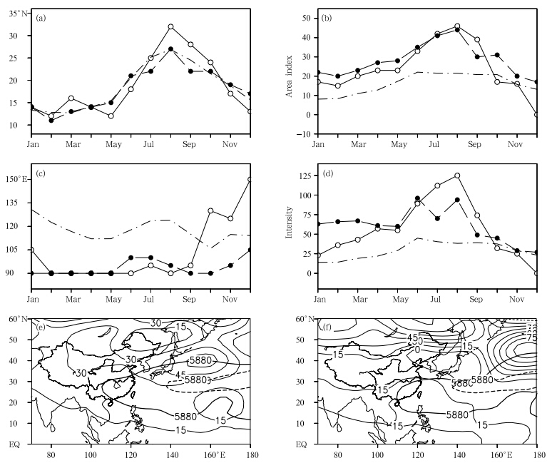 | Fig. 3.(a)Latitude of ridge line, (b)area index, (c)longitude of westernmost ridge line point, and (d)intensity ofthe WPSH in 1998 and 2010(dot-dashed lines indicate the climatological mean while the lines with closed and opencircles denote values in the years 1998 and 2010, respectively). Geopotential height anomalies at 500 hPa during thesummer of(e)2010 and (f)1998. The thick solid contour denotes the July-August mean of the "5880 gpm" line, the thickdashed contour denotes the climatological July-August mean of the "5880 gpm" line, and the anomaly contour interv al is15 gpm. |