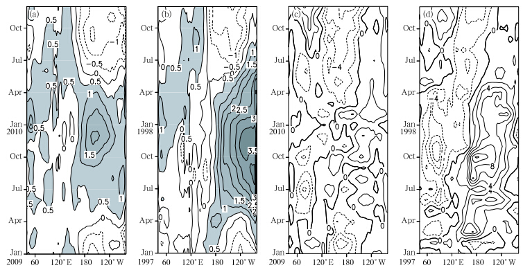 | Fig. 4. Time-longitude sections of the sea surface temperature anomalies(℃; contour interv al: 0.5℃; shadings denoteareas with SST A greater than 0.5℃)within 5°S-5°N for(a)2009/10 and (b)1997/98; and time-longitude sections ofzonal wind anomalies(m s-1; contour interv al: 2 m s-1)at 850 hPa within 5°S-5°N for(c)2009/10 and (d)1997/98. |