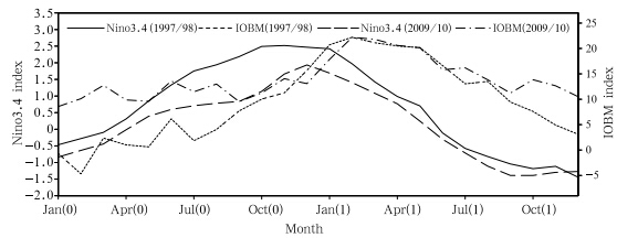 | Fig. 5. Evolution of the Niño3.4 and IOBM indices during 1997/98 and 2009/10. The numbers 0 and 1 denote thedeveloping and decaying years of El Niño, respectively . |