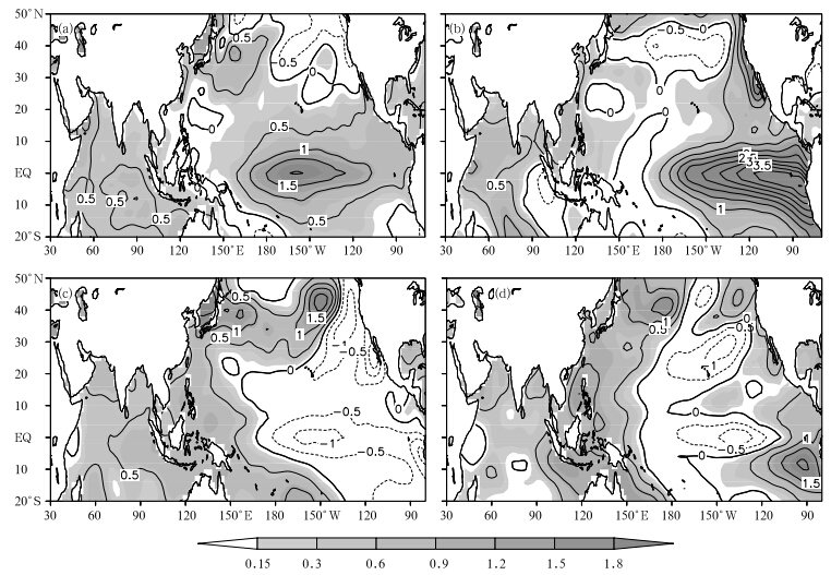 | Fig. 6. October-December mean sea surface temperature anomalies(SST As; ℃)in(a)2009 and (b)1997; and July-August mean SST As in(c)2010 and (d)1998. Contour interv al is 0.5℃, and areas with SST As greater than 0.15℃ areshaded. |