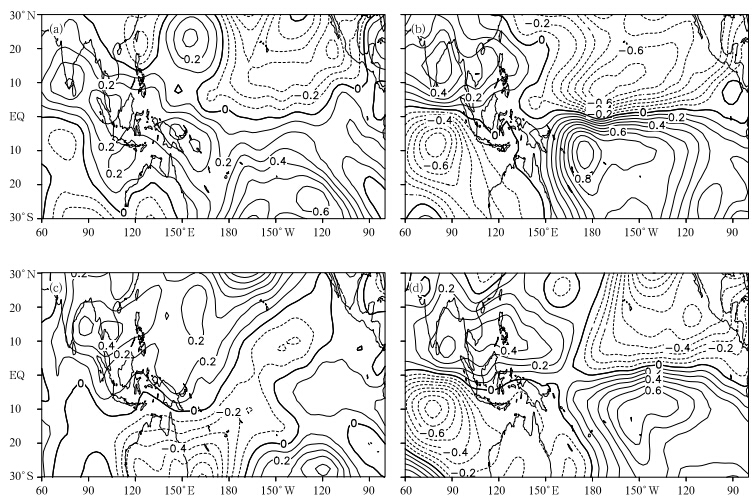 | Fig. 7. Streamfunction anomalies at 850 hPa in(a)October and (c)November 2009, as well as in(b)October and (d)November 1997. Contour interv al is 0.1×10-6 m2 s-1. |