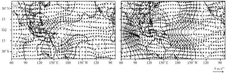 | Fig. 8. The 200-hPa velocity potential(contour; ×10-6 m2 s-1) and divergent winds(vector; contour interv al is 1×10-6 m2 s-1)in October-December of(a)2009 and (b)1997. |