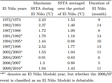 El Niño events are identified by a Niño3.4 index exceeding 0.5℃ and lasting for 5 months. Basedon this metric, 11 events in 1970-2010, 1972/1973, 1982/1983, 1986/1987, 1987/1988, 1991/1992, 1994/1995, 1997/1998, 2002/2003, 2004/2005, 2006/2007, and 2009/2010 are identified. Here, weexclude the 1986/1987 event because the SSTA in thetropical Pacific presents the pattern of El Niño in thesummer of 1987, and it therefore cannot be classifiedas the decaying phase of an El Niño event. Furthermore, according to the El Niño Modoki index(EMI)developed by Ashok et al.(2007), 5 of the remaining10 El Niño events are Modoki events. Table 1 showsthe characteristics of the 10 El Niño events. The2009/10 El Niño Modoki and the 1997/98 typical ElNiño represent the strongest events of their respectivetypes since 1970.
