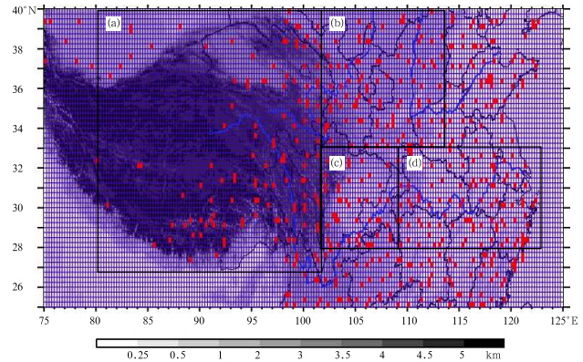 | Fig. 1. Topography(shadings)of the study domain and distribution of surface in-situ observation stations. The terraindata are from the GTOPO30 Global Digital Elevation Model, and are provided by the US Geological Survey's EMROSData Center. The purple grid indicates resolution of the satellite products. Red boxes indicate grid cells that containin-situ observation stations. The analysis domain is divided into four sub-regions as indicated by the black solid boxes:(a)the Tibetan Plateau(27°-40°N, 80°-102°E; H ≥ 3000 m);(b)the northeastern Tibetan Plateau(35°-40°N, 102°-110°E; 1000 m 6 H ≤ 3000 m), (c)the Sichuan basin(28°-32°N, 103°-108°E; H < 1000 m), and (d)the mid-lowerreaches of the Yangtze River valley(28°-33°N, 111°-122°E). |