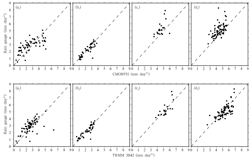 Figure 2 provides a comparison of average dailyprecipitation amounts over the four sub-regions duringthe warm season as observed by the satellites and therain gauges. The comparison is restricted to grid cellswith valid in-situ observations. TRMM 3B42 average daily precipitation amounts are closer to those observed by rain gauge stations than CMORPH averagedaily precipitation amounts. The TRMM 3B42 datasystematically underestimate daily mean precipitationover the Tibetan Plateau but perform well in the otherthree regions. The CMORPH data are largely consistent with the rain gauge data over the northeastern Tibetan Plateau, but differ from the rain gaugedata over the other three regions. CMORPH underestimates average daily precipitation amounts in regionswith precipitation lower than 3 mm day-1 but overestimates precipitation in regions with precipitationhigher than 3 mm day-1 over the Tibetan Plateau.Tian et al.(2007)reported similar differences betweenthe CMORPH and TRMM 3B42 satellite precipitationproducts over the southeastern United States. This islikely due to the application of a GPCC(Global Precipitation Climatological Center)based monthly amplitude adjustment algorithm in the TRMM 3B42, which helps reduce the biases in long-term aggregations in this dataset(Huffman et al., 2007).