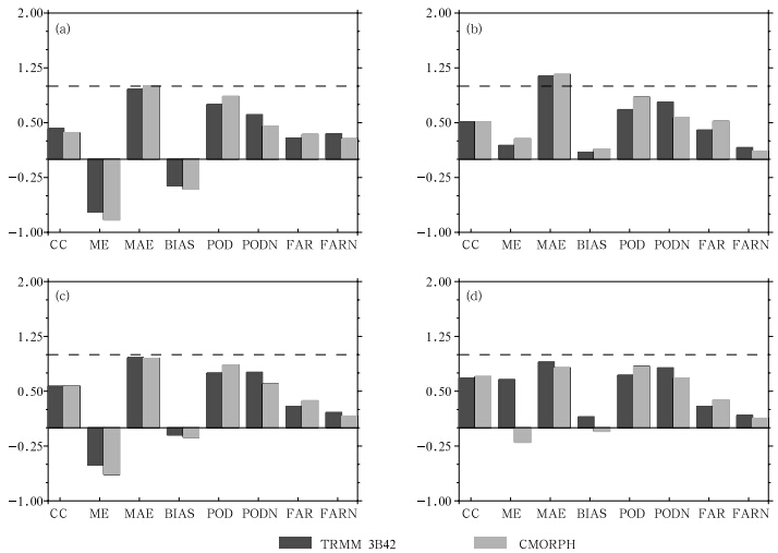 We next validate the ability of the two satelliteproducts to accurately reflect the frequency of dailyprecipitation occurrence. We focus on the frequencies of days with and without detectable precipitation. The POD is approximately 0.72 for TRMM3B42 and 0.85 for CMORPH. These results reveal thatboth satellite products perform well in detecting precipitation events, with CMORPH performing betterthan TRMM 3B42. However, the CMORPH FAR isapproximately 0.37, and is higher than the TRMM3B42 FAR in all sub-regions. The FARs of both satellite precipitation products are the highest over thenortheastern Tibetan Plateau, with an FAR of 0.4for TRMM 3B42 and 0.52 for CMORPH. However, the PODN is the lowest over the Tibetan Plateau, with values of 0.61 for TRMM 3B42 and 0.45 forCMORPH. The values of PODN over the other threeregions are approximately 0.78 for TRMM 3B42 and 0.6 for CMORPH. In this respect, TRMM 3B42 performs better than CMORPH. The FARN is approximately 0.3 over the Tibetan Plateau regardless of thesatellite dataset used. This value is higher than thosecalculated for the other three sub-regions, where values of FARN are approximately 0.15. These resultsshow that the two satellite precipitation products aregenerally able to differentiate days with precipitationfrom days without precipitation. The performance ofthe satellite precipitation products is worse over theTibetan Plateau than over the other sub-regions.