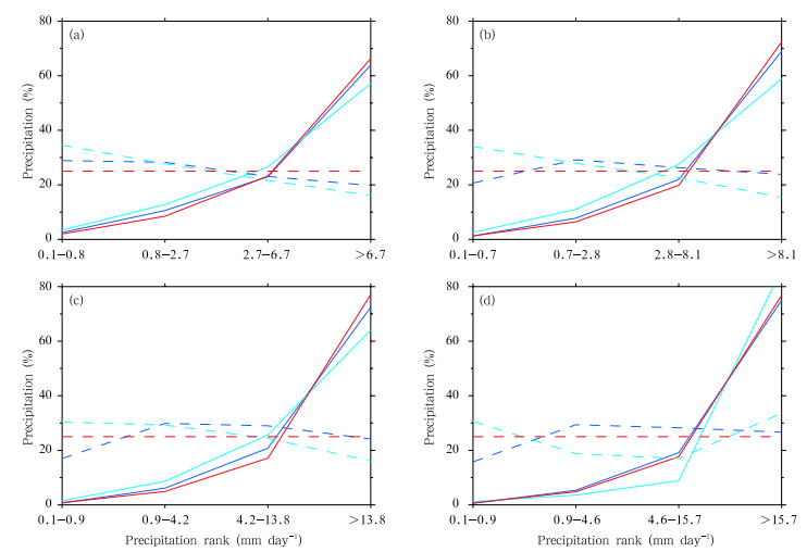 Precipitation intensity can be classiβed into ranksaccording to either the βxed quantity of precipitationthat accumulates over 24 h(e.g., Shou et al., 2002)or the percentiles of precipitation intensity(e.g., Karl and Knight, 1998; Zhai et al., 2005; Zhang and Zhai, 2011). Relative intensity ranks by percentiles of dailyprecipitation are more appropriate in this case because daily precipitation amounts vary substantiallywithin our study domain. We sort daily precipitationdata into four intensity ranks(weak, moderate, heavy, and intense)for each sub-region. The boundaries ofthese intensity ranks are set at the 25th, 50th, and 75th percentiles of precipitation intensity based on insitu rain gauge observations. For the Tibetan Plateau, weak precipitation includes rain rates of 0.1-0.8 mmday-1, moderate precipitation includes rain rates of0.8-2.7 mm day-1, heavy precipitation includes rainrates of 2.7-6.7 mm day-1, and intense precipitationincludes all rain rates that exceed 6.7 mm day-1. Forthe northeastern Tibetan Plateau, the respective ranksare 0.1-0.7, 0.7-2.8, 2.8-8.1, and > 8.1 mm day-1; forthe Sichuan basin, the respective ranks are 0.1-0.9, 0.9-4.2, 4.2-13.8, and > 13.8 mm day-1; and for themid-lower reaches of the Yangtze River, the respectiveranks are 0.1-0.9, 0.9-4.6, 4.6-15.7, and > 15.7 mmday-1, respectively. Figure 4 shows the distributionsof precipitation amount and frequency over these fourintensity ranks based on both satellite and rain gaugedata in each sub-region. This comparison allows usto validate the ability of the satellite products to accurately capture the occurrence of daily precipitationevents in different intensity categories.