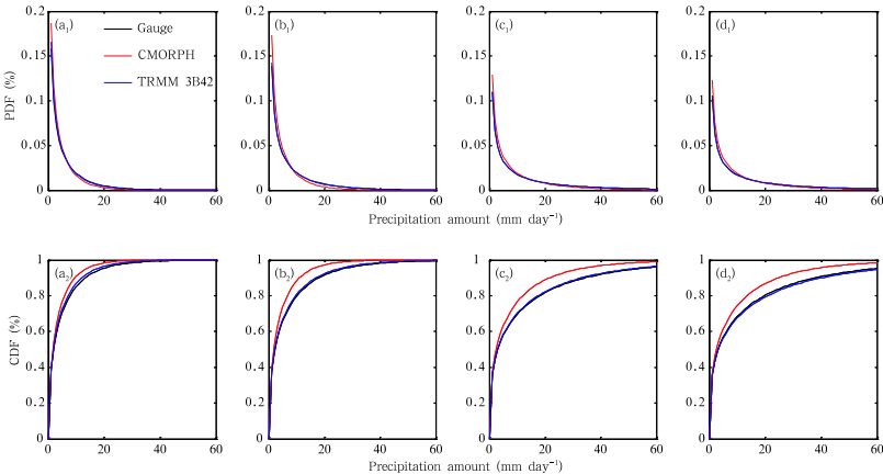 5)The gamma distribution of daily precipitationamount based on TRMM 3B42 data is very similarto that based on rain gauge observations. The cumulative distribution function(CDF)of the CMORPHgamma distribution is biased toward lighter precipitation events.