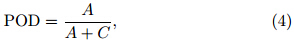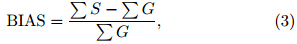 In Eqs.(1)-(3), S is the satellite estimate of daily precipitation amount, G is the rain gauge observation ofdaily precipitation amount, G is the time-average dailyprecipitation amount according to rain gauge data, and N is the number of samples. In Eqs.(4)-(7), A + C is the total number of days on which precipitation exceeds the minimum threshold according tothe rain gauge data, A+B is the total number of dayson which precipitation exceeds the minimum thresholdaccording to the satellite precipitation data, B + D isthe total number of days on which precipitation fails toexceed the minimum threshold according to the raingauge data, and C + D is the total number of dayson which precipitation fails to exceed the minimumthreshold according to the satellite precipitation data.See Table 2 for more details on the variables used inEqs.(4)-(7). Note that the uint of ME is mm day-1 and the other statistics are all dimensionless.![]() |