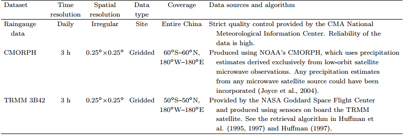Concerns about climate change and extremeevents have motivated a number of studies on improving the accuracy and homogeneity of rain gaugedata in China(Ren et al., 2003, 2010; Li et al., 2005; Jiang et al., 2008). Rain gauge observationsare normally regarded as the most reliable precipitation data, particularly when compared with satelliteprecipitation products. However, the spatial distribution of stations entails certain limitations, especiallyin marine areas and regions of complex terrain. Highresolution satellite precipitation data provide substantial improvements in spatial distribution relative tostation data. Satellite products and in-situ observations are derived according to different principles and are biased against each other(Dai et al., 2007; Zhou et al., 2008; Xie et al., 2007). Satellite products musttherefore be validated against rain gauge data to better underst and their capability for accurately reflecting the characteristics of precipitation. Previous assessments of daily satellite precipitation products(e.g., Dinku et al., 2008; Tian et al., 2007)have revealed thatthe CMORPH(Climate Prediction Center MorphingTechnique) and TRMM(Tropical Rainfall MeasuringMission)3B42 products provide better estimates ofprecipitation than any other satellite products, especially in regions of complex terrain.