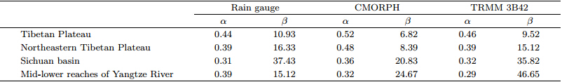 TRMM 3B42 provides better agreement with raingauge observations than CMORPH, with respect toboth warm season average precipitation amount and daily precipitation amount. TRMM 3B42 also provides a good estimate of the amount of precipitationthat occurs during events of different intensity ranks;however, it underestimates the frequency of weak precipitation events in the Sichuan basin and the midlower reaches of the Yangtze River. CMORPH substantially overestimates the amount of precipitationassociated with intense precipitation events and underestimates the amount of precipitation associatedwith other events in the mid-lower reaches of theYangtze River. By contrast, CMORPH underestimates the amount of precipitation associated with intense events and overestimates the amount of precipitation associated with other events over the otherthree regions. CMORPH overestimates the frequencies of intense and weak precipitation events and underestimates the frequencies of other events in themid-lower reaches of the Yangtze River. In the othersub-regions, CMORPH overestimates the frequency ofweak precipitation events and underestimates the frequency of intense precipitation events.5. The gamma distribution
