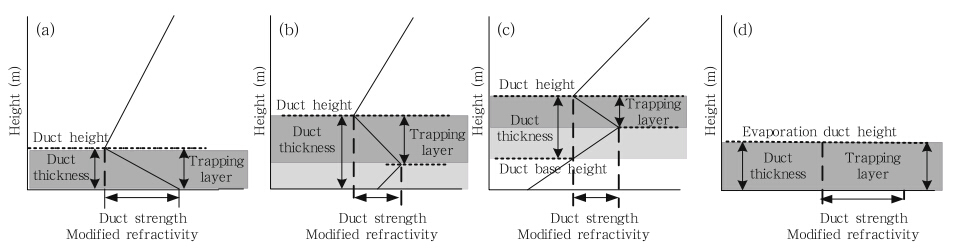 | Fig. 1. Typical modified refractivity M profiles for(a)simple surface duct,(b)S-shaped surface duct,(c)elevated duct, and (d)evaporation duct(from Atkinson et al., 2001). |