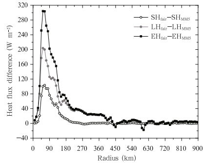 | Fig. 10. Radial distribution of the azimuthally averagedsensible heat(SH),latent heat(LH), and enthalpy(EH)flux differences(EXP-3 minus EXP-2)at 1200 UTC 28June. |