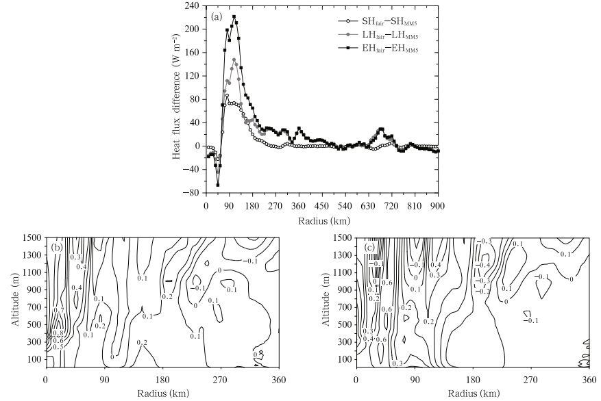 | Fig. 11.(a)Radial distribution of the azimuthally averaged heat flux difference; and radial-vertical cross-sections ofthe azimuthally averaged differences(EXP-3 minus EXP-2)of(b)water vapor mixing ratio(g kg−1) and (c)potentialtemperature(K)during 66–72 h. |