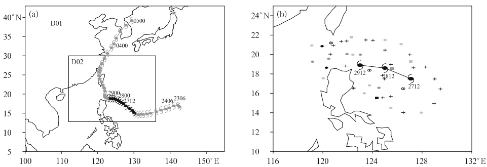 | Fig. 2.(a)The best track of Typhoon Mindule (2004) from the JMA data and the model domain configuration.(b)Thedropsonde deployment around Mindule as well as the observed duct locations. The typhoon symbol indicates positionof the typhoon center. Solid circles indicate dropsonde-derived duct positions with tops less than 1000 m; solid paneindicate duct positions with tops between 1000 and 2000 m; hollow circles with a vertical line in the center indicate ductpositions with tops above 2000 m. Black symbolizes strong duct(δM > 10 M; δM is duct strength); gray symbolizesmoderate duct(5 M <M ≤ 10 M); shallow gray symbolizes weak duct(δM ≤ 5 M). Plus signs indicate the positions ofdropsondes with no duct observed. |