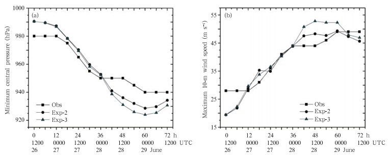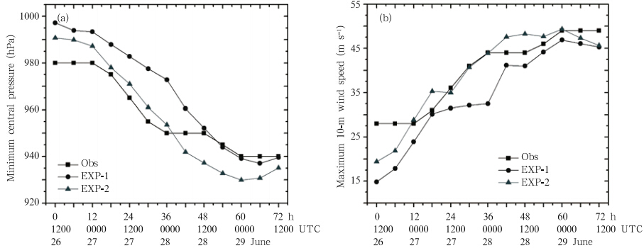 | Fig. 3. Time series of(a)minimum sea level pressure(hPa) and (b)maximum 10-m wind speed(m s−1)for TyphoonMindule(2004)from EXP-1 and EXP-2. |