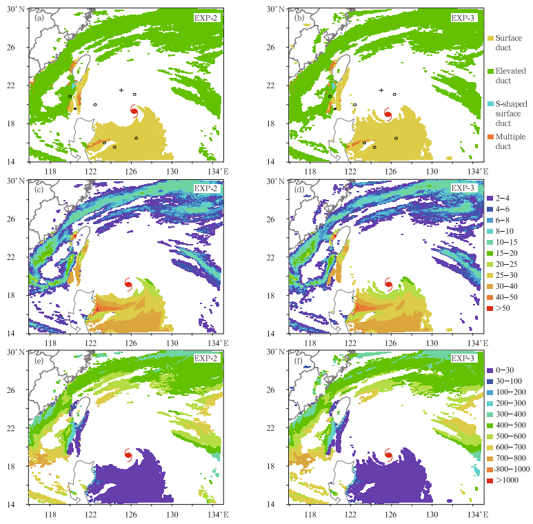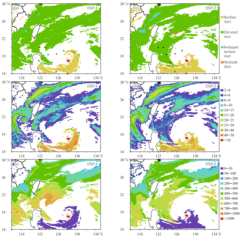 | Fig. 4. Horizontal distributions of the simulated(a,b)duct type,(c,d)duct strength in M, and (e,f)duct height in m,from(a,c,e)EXP-1 and (b,d,f)EXP-2 at 1200 UTC 27 June. The typhoon symbol indicates position of the typhooncenter; empty circles indicate dropsonde-derived elevated duct positions while solid circles indicate the dropsonde-derivedmultiple elevated ducts. |