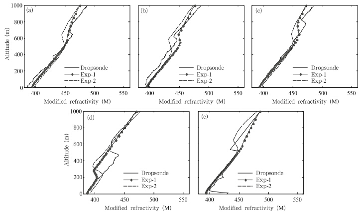| Fig. 5. Vertical profiles of modified refractivity from EXP-1 and EXP-2 versus the GPS dropsonde measurements. |