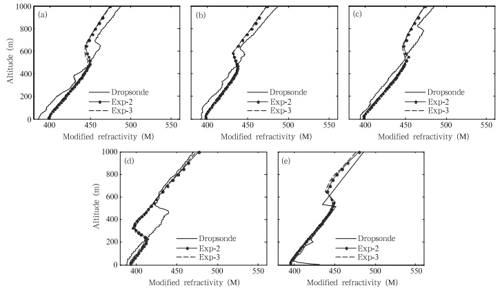 To further investigate the effect of sea spray ontyphoon duct structure,the M profiles from EXP-2 and EXP-3 together with the GPS dropsonde measurementsare compared in Fig. 8. It is shown thatsea spray mainly affects the duct strength and thickness,but the effects are not significant. The sea sprayeffects may cause typhoon duct to strengthen and canalso cause it to weaken.