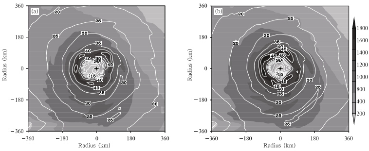 | Fig. 9. Distributions of enthalpy flux(shaded; W m−2) and 10-m wind speed(contour; m s−1)within 360 km aroundthe typhoon center from(a)EXP-2 and (b)EXP-3 at 1200 UTC 28 June. Note that the center of each panel indicatesthe typhoon center. |