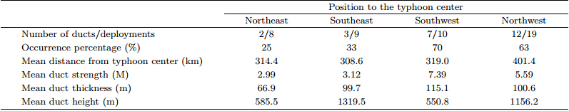 Despite the above studies,the occurrence of typhoonducts is still not well documented,since theprevious studies are usually based on conventional radiosondedata over l and . The coarse vertical resolutionof the radiosonde data may smooth out some ductinglayers and broaden the thickness of ducts. Moreover,these data are usually obtained over l and . The surveyof typhoon ducts over oceanic areas is incompletebecause the information about ducts in or around typhoonsover the sea is unavailable. Owing to the implementationof the “Dropsonde Observation for TyphoonSurveillance near the Taiwan Region(DOTSTAR)”program,more refined structures of temperature and humidity profiles with vertical resolutionsof about 5–6 M are revealed through using the globalpositioning system(GPS)dropsondes in or around typhoons.The DOTSTAR program provides a strongdatabase for studies on the occurrence and structureof typhoon ducts over the sea. Ding et al.(2013)showthat typhoon ducts are likely to form in all directionsaround the typhoon center,with an average distanceof about 412.8 km from the center; they occur morefrequently and are much stronger in southwest and northwest directions than in the other directions; withthe increase of typhoon intensity,the associated ductsinside typhoons tend to be much stronger and thicker and to appear at higher altitudes. But the followingproblems remain: the GPS dropsonde data are gatheredfrom single point observations with a coarse spatialresolution, and their deployments are somewhatr and om relative to the typhoon center; besides,thetemporal continuity of the dropsonde observations islimited since one research flight can only last for 3 hor so.