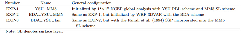 In this study,three numerical experiments(seeTable 2)were designed to evaluate impacts of the BDA and SSP on the ducting process induced by TyphoonMindule(2004). All the experiments were initializedat 1200 UTC 26 June 2004 and ended at 1200 UTC29 June 2004. During this period,the DOTSTARprogram carried out a three-day observation for TyphoonMindule(2004),providing valuable measurementsto verify the model results. EXP-1 was initializedwith 1°×1° NCEP global final analysis datawith the above physical parameterizations. The configurationof EXP-2 is the same as that of EXP-1,except that the EXP-2 initialization used the WRFthree-dimensional variational(3DVAR)data assimilationsystem with the BDA scheme(Xiao et al., 2008).The BDA scheme was only applied to the coarse gridD01. For D02,all the variables were interpolated fromthose of D01. The background error covariance wascalculated from 1-month statistics during 12 June–12 July 2004 using the NMC(National MeteorologicalCenter)method(Parrish and Derber, 1992). Toevaluate the impact of sea spray on typhoon ducts,EXP-3 was conducted,in which the surface interfacialfluxes were calculated from st and ard MM5 SL schemein WRF v3.2,whereas the sea spray fluxes were computedby the Fairall parameterization scheme(Fairall et al., 1994). More details were given in Zheng et al.(2008). Since the combination of WRF 3DVAR and the BDA scheme can potentially greatly improve thetyphoon intensity forecast,this combination was retainedin EXP-3.