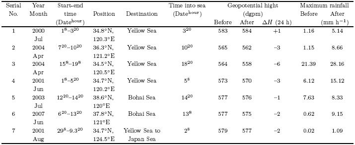 | △(24 h)is the daily geopotential height change at 500 hPa calculated at the time of the vortex entering into the sea. Thesupscript "hour" in columns 8 or 20 denotes Beijing time. | ||||||||||