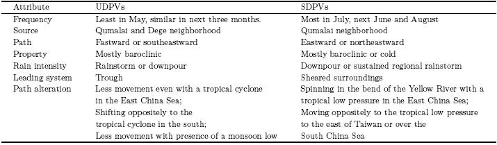 Table 7 compares the characteristics of SDPVs and UDPVs in different aspects, such as frequency, source, path, thermadynamic property, leading syn-optic system, and path alteration. It is interesting tonote that with the presence of a tropical low pressuresystem, SDPVs have a higher chance to recurve overthe bend of the Yellow River.